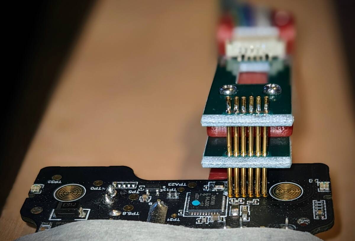 Pogo pin clamp connected to the ISP header on the PCB