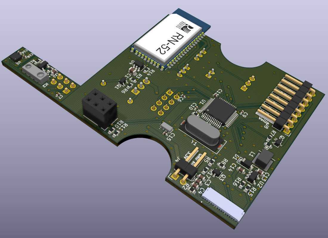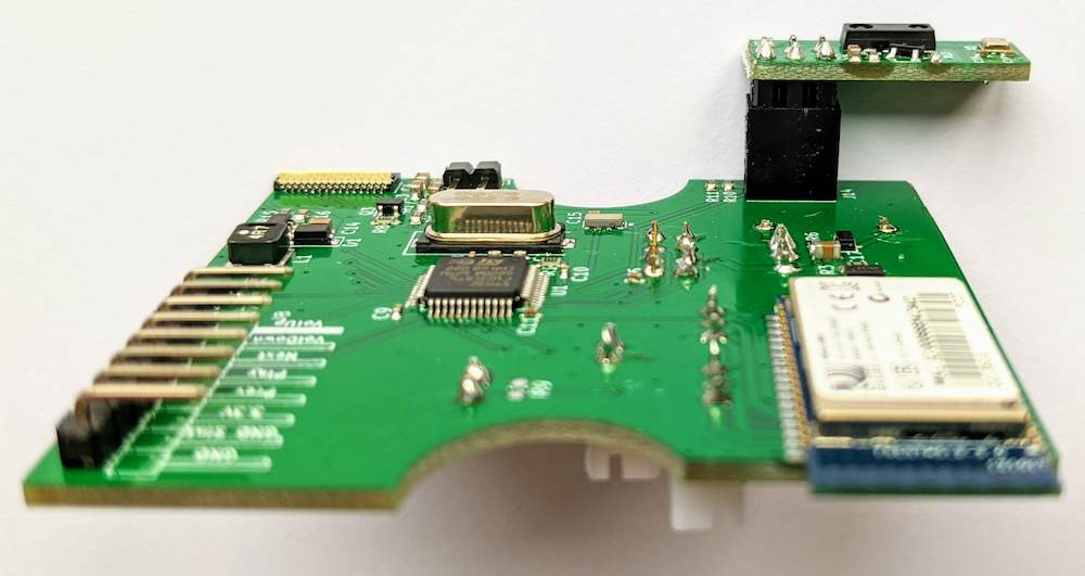 The finger-like piece extending out the side of the PCB is the daughterboard, which is separated after fabrication and mounted via a connector, as seen the final images below. The next post describes the mechanical design behind this.