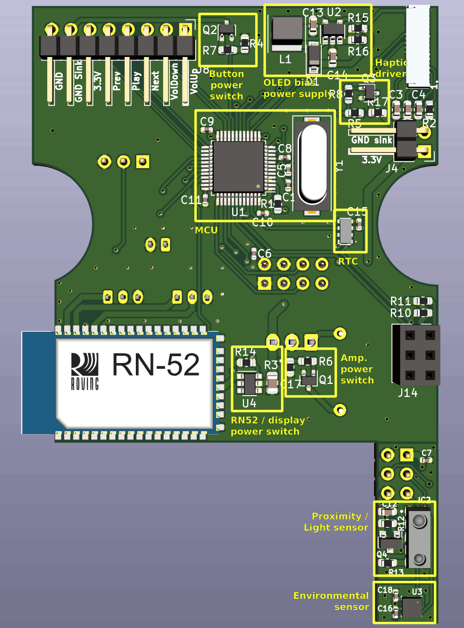 - Environmental, ambient light, proximity sensors and RTC connected to the MCU over I2C.