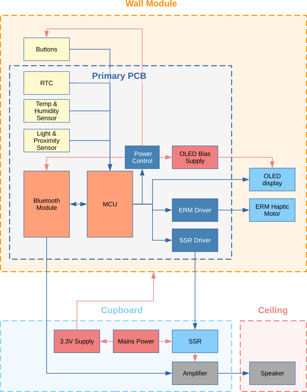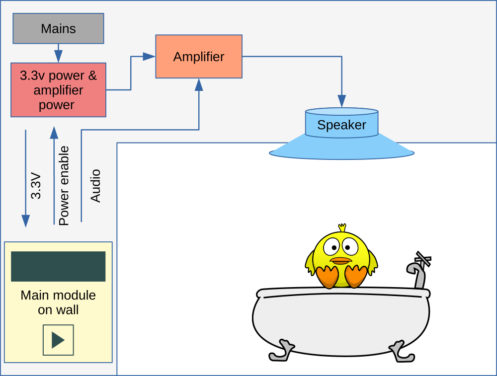 A separate amplifier housed in a cupboard will connect to a ceiling mounted speaker. To ensure minimal power usage, the amplifier’s power will be switched by the module. The overall arrangement will be like this: