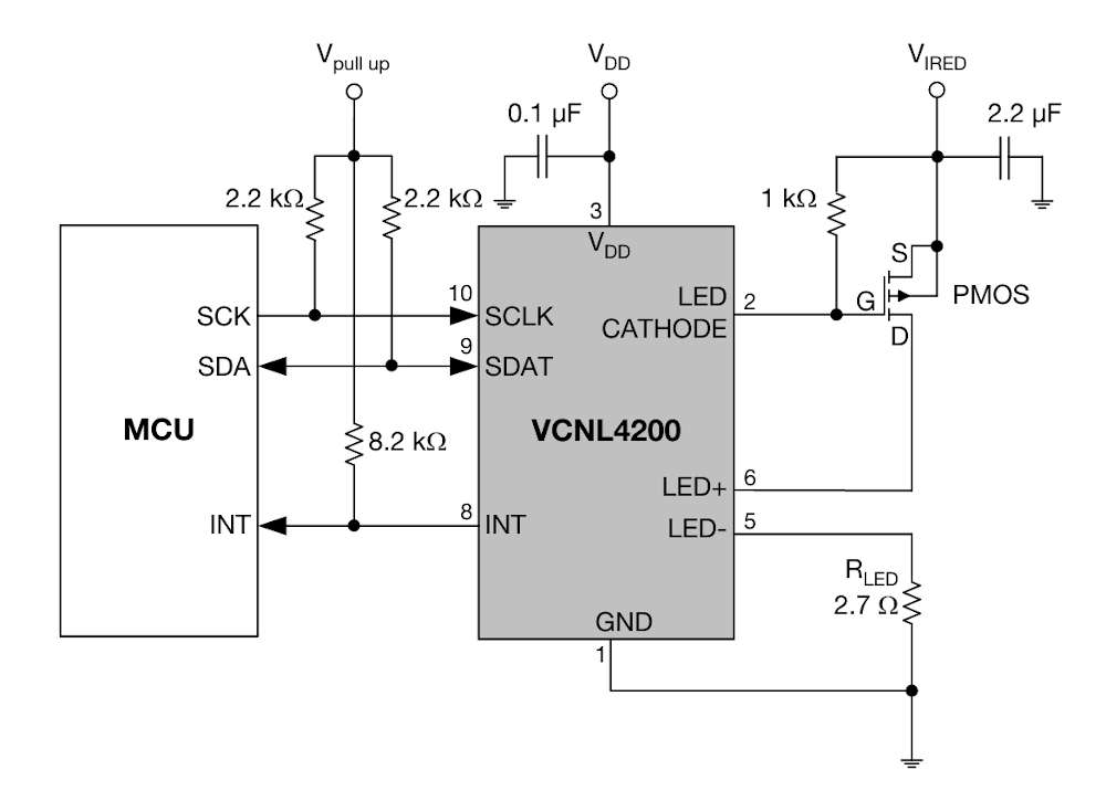 Upon looking closer at the VCNL4200 architecture though, I couldn’t understand why a lower voltage for the LED wasn’t possible. The reference circuit uses an external PMOS FET to switch the LED, with the LED_CATHODE triggering the FET. The circuit shows a 1k pullup on the gate, suggesting that the LED_CATHODE pin is high-Z when off, and sinks when on. If this is the case, there shouldn’t be any issue using a lower voltage, since the LED’s Vfwd at its Ifwd maximum of 800mA is 2.5V.