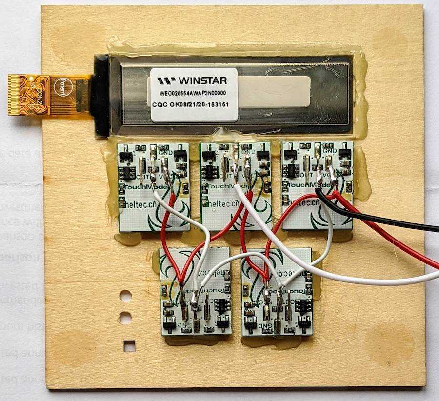 I had previously played around with these [PDF] pre-built capacitive touch buttons and knew them to be sensitive enough to work behind a millimetre or so of wood. They include colored LEDs that glow when touched, and so by etching all the way through the wood in parts and filling the holes with casting resin, a pleasing visual feedback mechanism should be possible.
