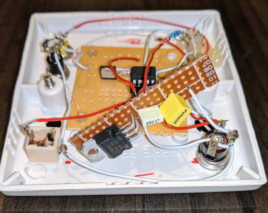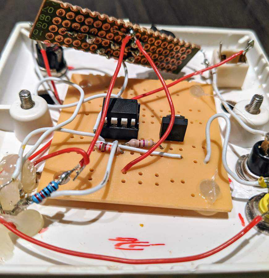 Given the simplicity of the circuit, I used a generic breadboard PCB rather than a custom piece. It’s ugly as hell, but gets the job done.