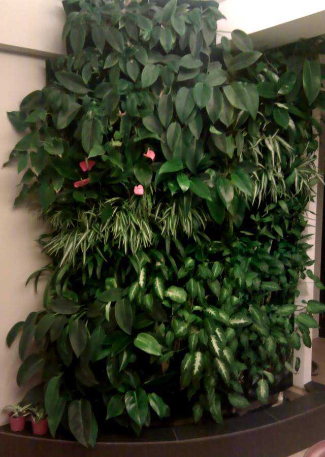 The design is relatively simple. The wall itself is plaster covered solid brick and follows a gentle curve. Mounted on the wall face are several sheets of Sintra board (expanded closed-cell PVC), held about 100mm off the wall with aluminium brackets. Two layers of 5mm polyester felt are stapled to the Sintra board and the plants’ roots sit between the two felt layers (via an incision in the front layer).