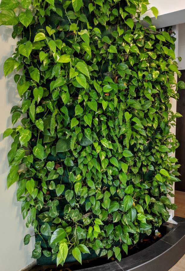 At the base of the wall is a water trough. A submerged pump periodically pumps water from the trough to the top of the wall, where it drains from a horizontally mounted PVC pipe with small holes at fixed intervals. The water flows down the felt, watering the plants along the way, and drains back into the trough.