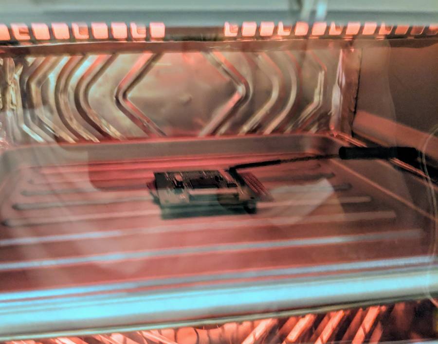 How do you reflow the board for a controller in a reflow oven? You use the same oven with a human controller of course. After applying paste and placing the components, I hooked the thermocouple up to a multimeter to monitor the temperature and manually cycled the oven power via the SSR in an attempt to follow the profile as closely as possible.