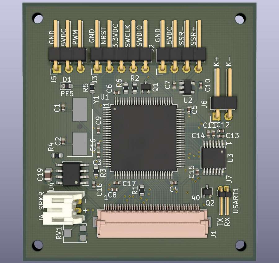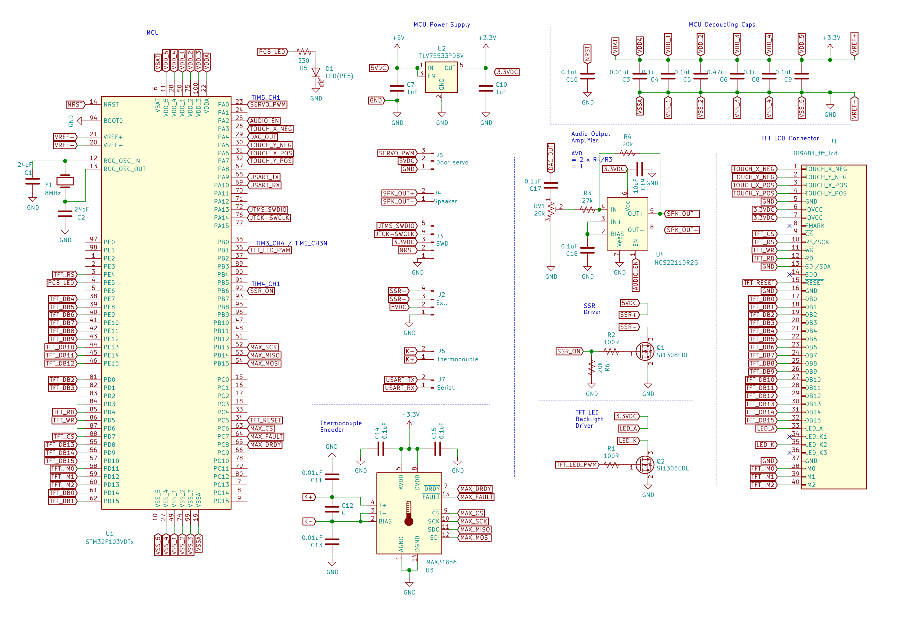 Below is the full schematic and PCB design, created in KiCad. I won’t go into detail on the PCB design; it’s pretty straightforward. The TFT LCD uses a 40-pin FPC connector, which sits at the left of the board. The audio section with a pot volume control is on the top-left and the thermocouple encoder is on the bottom. The thermocouple connector is right next to the IC to minimize thermal gradient, with all other connectors (excl. the USART and speaker) at the right side.