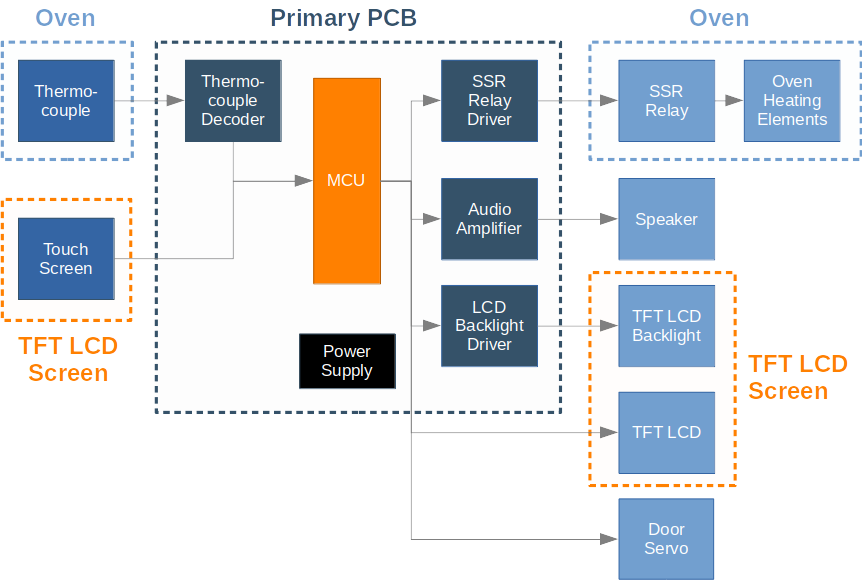 With a regulated 5VDC 600mA supply from the oven, we can setup a 3.3V regulator for the MCU and backlight and use the 5VDC for everything else.