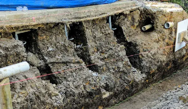 There are many drainage aspects to this project.: A plethora of drainage locations Long drain behind the upper retaining wall to prevent water placing pressure behind the wall. Trench drain on top of that wall for surface water. Trench drain on the pool deck for splash water and rain. Subsurface drain for edge landscaping. Drainage for flower bed. Drain beneath pool to prevent hydrostatic pressure. We’re addressing this last one today.