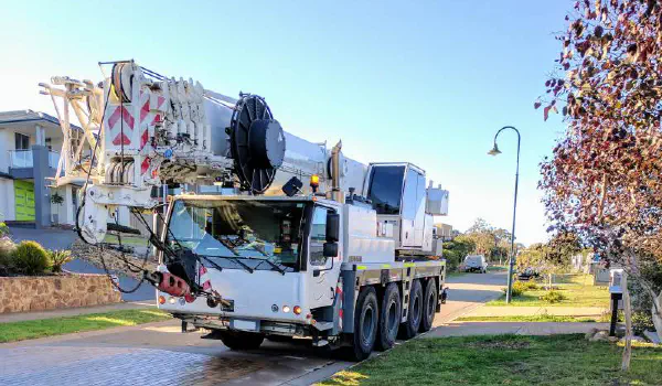 70-tonne Liebherr mobile crane arriving It’s time for step two of moving the pool shell into place (step one being already complete).