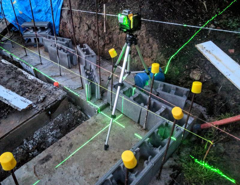 In addition to ensuring consistent height, the walls must be perfectly straight, meet at the corners (in multiples of block length), and perhaps most importantly, be vertical. Since only the first course is mortared, it must be perfectly horizontal or the wall will will have a lean as the remaining courses are stacked on top of it. This can (and was) partially offset through the use of slivers of plastic inserted between the blocks, but the initial placement was crucial.