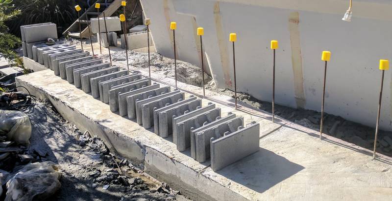 To provide tensile strength to the walls, vertical and horizontal steel reinforcement is required. The starter bars from the footing are continued all the way past the top of the wall to where the bond beam will be. Horizontal N12 bars are placed every 400mm with an N16 bar around the top perimeter.