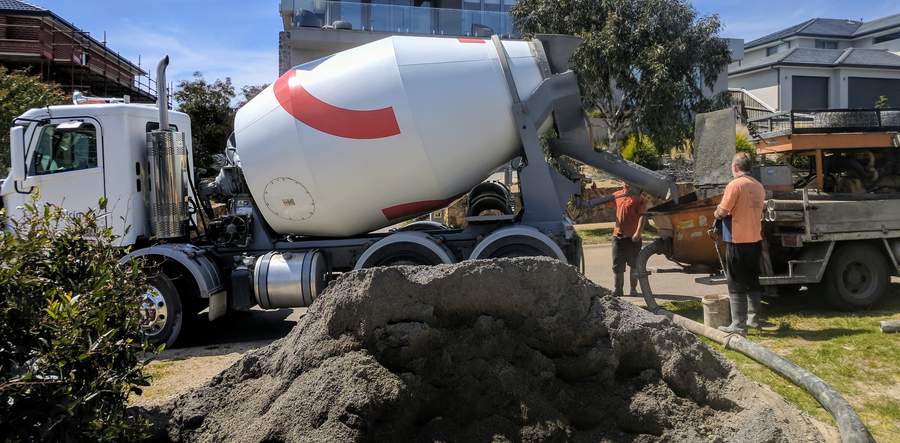 The readymix truck pours directly into the hopper on the concrete pump truck.