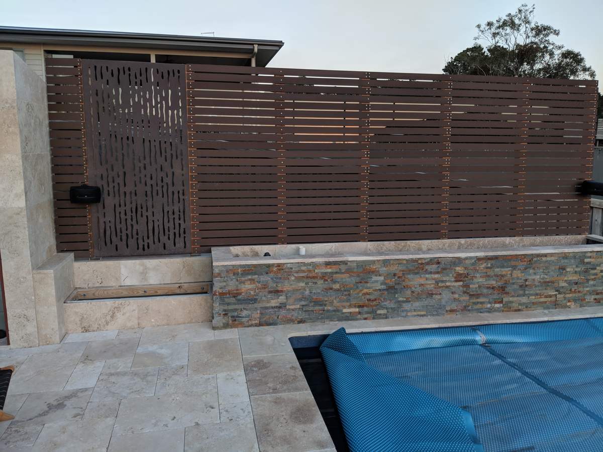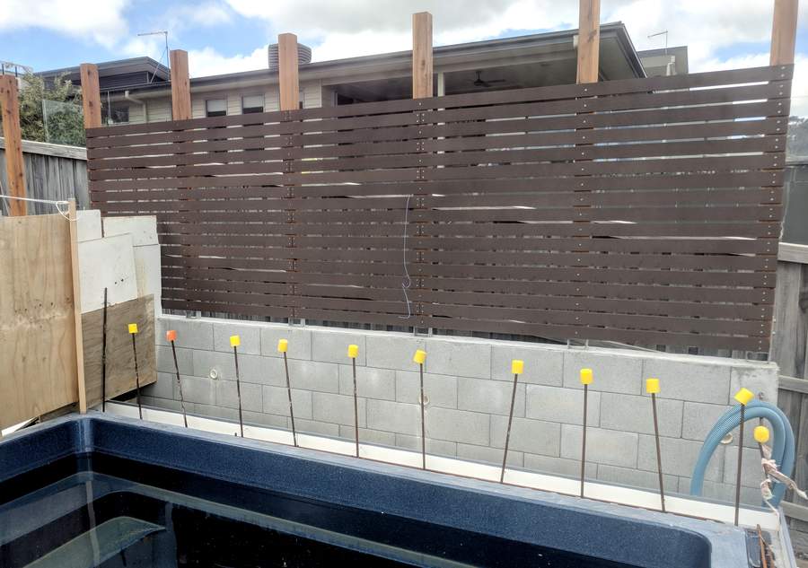 In the service of privacy, we decided to erect a modest privacy fence at the uphill end of the pool. Rather than full blackout, we are using 70mm horizontal slats with 10mm gaps between the slats. This gives ample privacy, while still allowing light through.