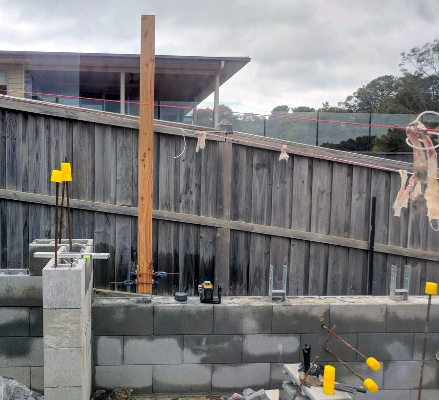 With 900mm spacing and a height of 1800mm, calculations accounting for potential wind loading give us a required post size of 90x90mm. The more difficult question is how to attach the posts to the top of our our retaining wall.