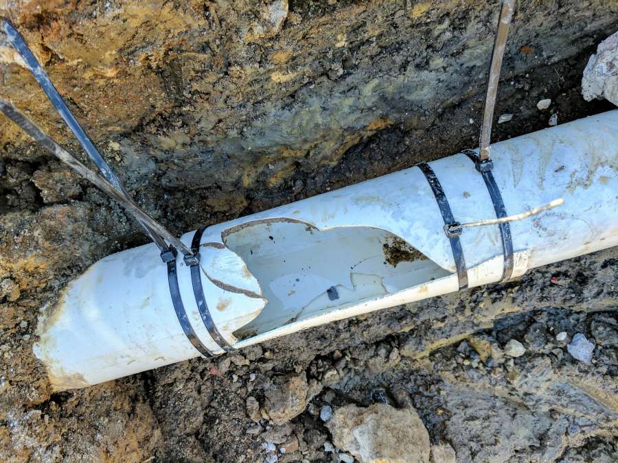 Nothing quite describes the sense of urgency engendered by the high pitched cracking of PVC pipe and a six foot high stream of water shooting in the air. The first pipe hit turned out to be a storm water pipe traversing the edge of the site from the gutter down pipes on one side of the house to the rain water tank. Water empties into the tank at around the two meter level, and so the pipe from the gutter was like a big U and full of water.
