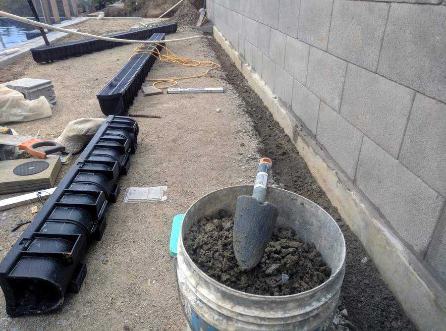 To secure the trench drain in place, a thin layer of concrete is placed beneath and around it.