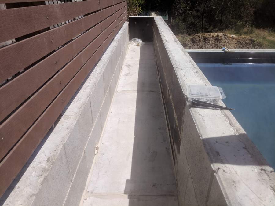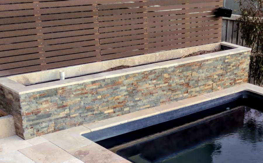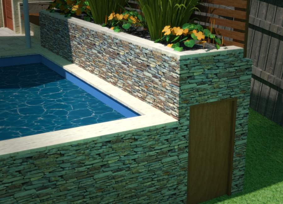 Where there is water, there should be plants. To this end, the design includes a generous flower/plant bed at the shallow end of the pool. The design is such that the top 600mm or so is plant bed, while beneath that we have a large storage cupboard, accessible via a door from the lawn below. The final product should look something like this: