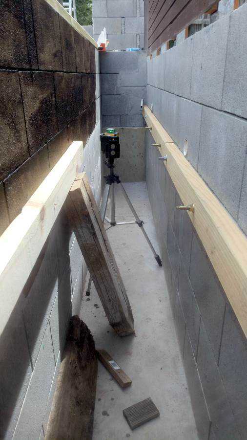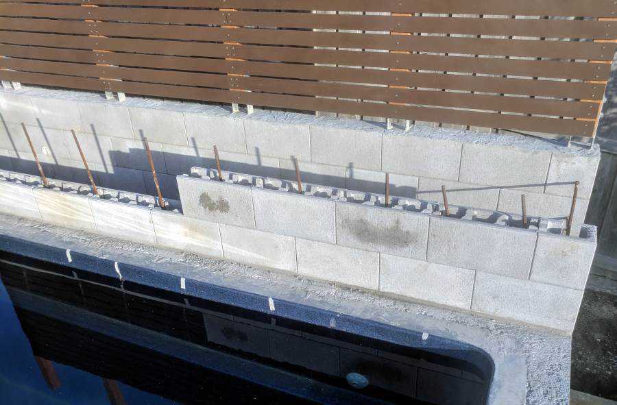 The walls are 190mm solid concrete with steel reinforcement on the rear side and 150mm on the front. Their strength is well in excess of what is required to retain the plant bed soil. Unlike the prior concrete work, we mixed the concrete for the garden bed walls onsite, given the smaller volumes required.