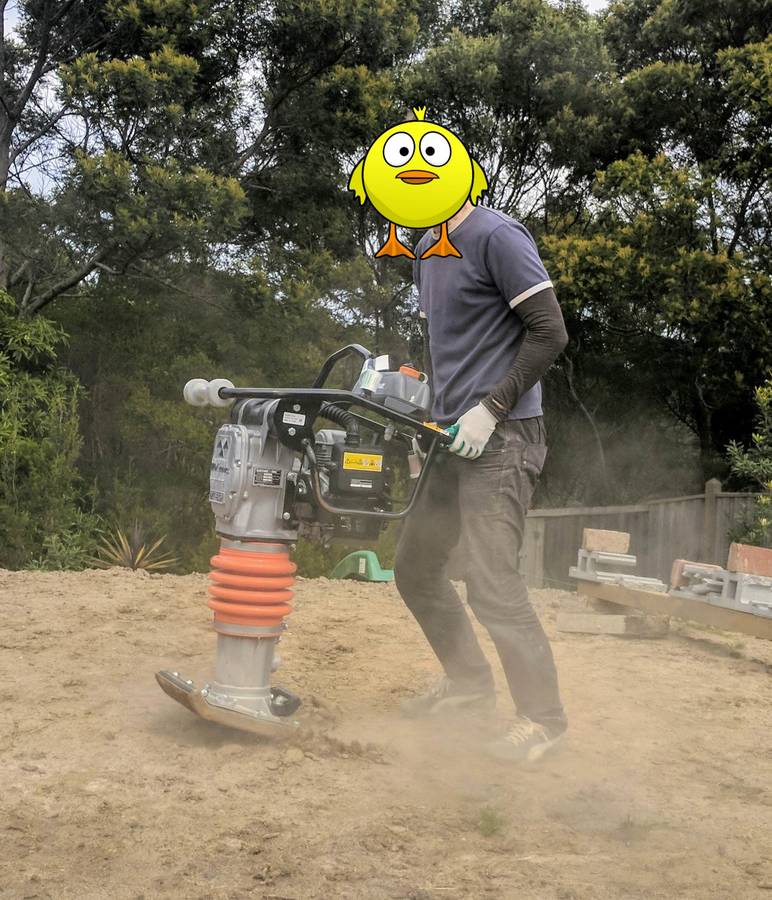 The process of excavating loosens the dirt considerably, and when it is replaced onto the ground, there is much air trapped within. If left in this state, it will gradually consolidate over time, sinking unevenly and resulting in a knobby, uneven surface. To hasten the process, we used a rammer. This device has a large metal foot, which - as the name implies - rams the earth with great force to compress and consolidate it.
