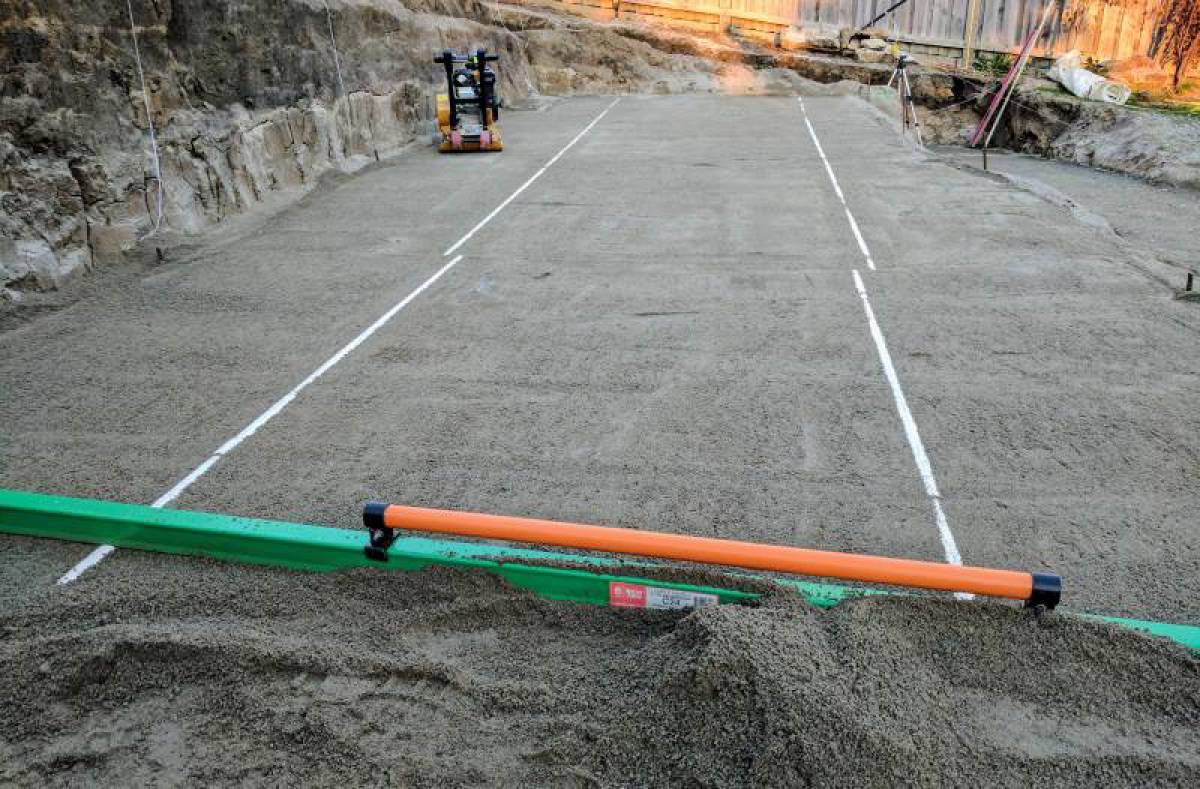 To achieve the correct slope and elevation, I used my laser level to setup two 50mm pipes as screed rails. Once these rails were set to the correct slope and height, I could then screed crusher dust to produce an accurate surface, compact, screed again, compact, and so on. The image below shows the almost complete result while the rails were still in: