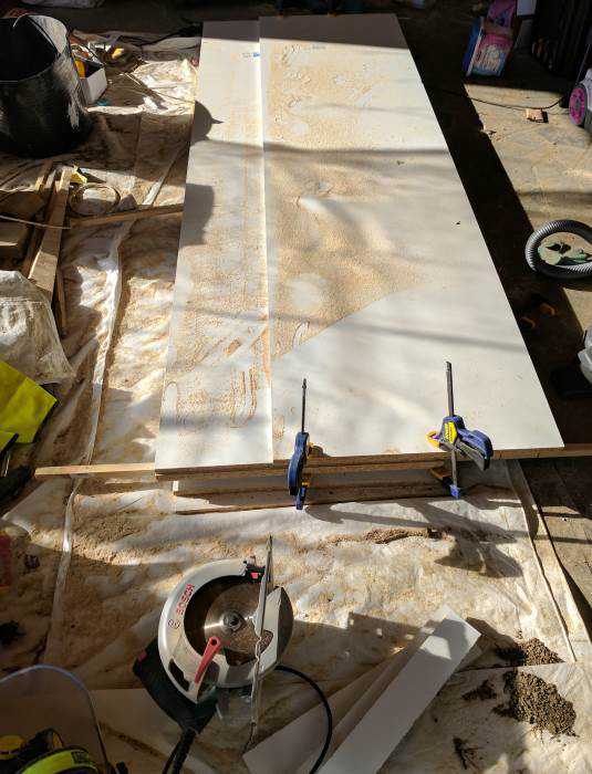Our forms are likely to be single use and we’re on a tight budget so we’re using melamine covered particleboard. This is the type of wood you typically find in Ikea furniture and kitchen cabinets. It’s crap. It’s made from wood flakes glued together with semi-toxic adhesives and is anything but waterproof*. It is however very cheap and will suffice for one-time formwork. The melamine coated surfaces are waterproof and to protect the sawn edges against rain during the construction period we’re painting them with an acrylic paint.