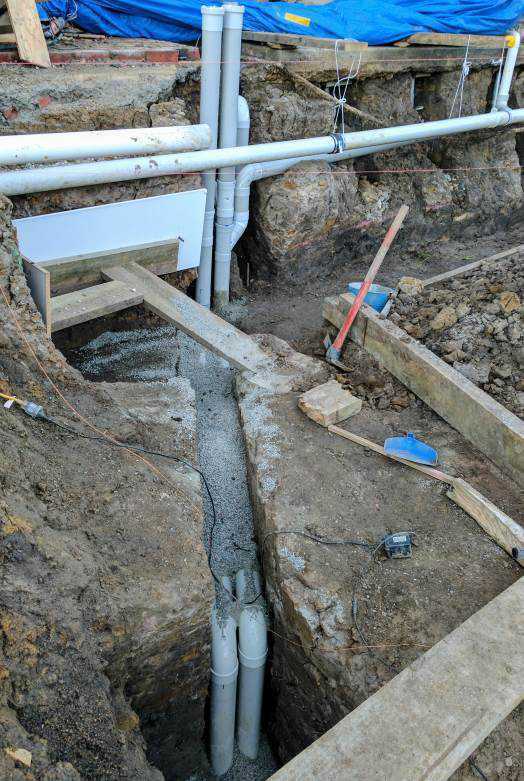 Maze of new pipework: sewage and storm water with new inspection points (left) and new gully for the pool filter backwash (right).