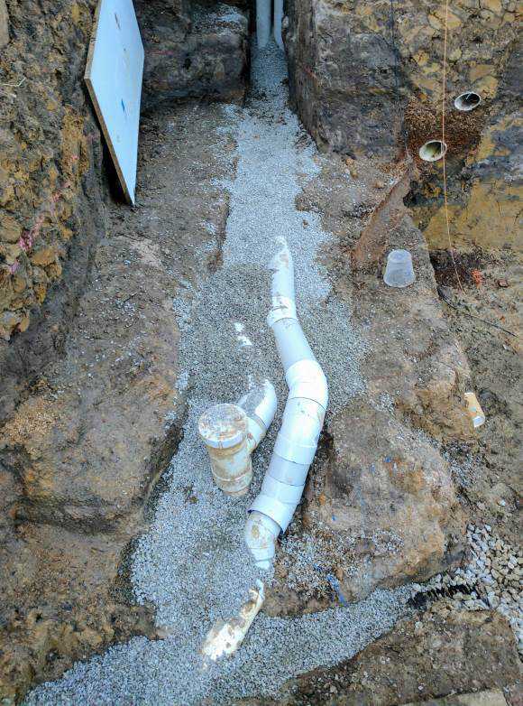 We finally had the plumber here today to repair and reroute the pipes that were “discovered” during the excavation. Because they connect to the public utility, we’re not permitted to repair the pipes ourselves, but we can (and did) prepare the trenches for the new route, so it was just a matter of laying the pipe and cementing a few connections.