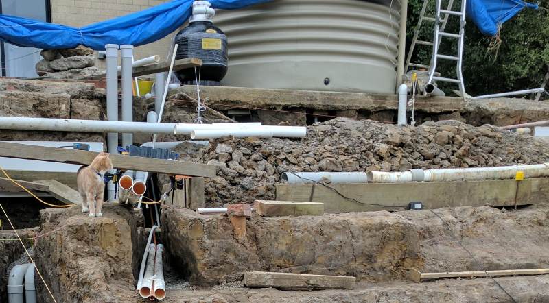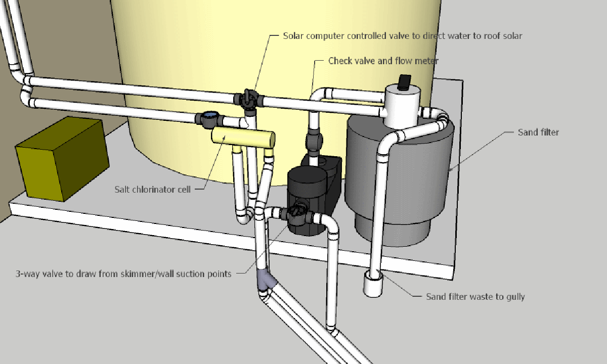I’ve also endeavored to keep the equipment pad (i.e. place where the pump, filter, and chlorinator will go) relatively close to the pool. After consideration, the only reasonable location is beside the existing water tank, about 5 meters beside the pool and 1.2 meters above it.