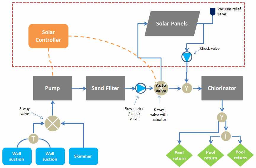 The simplest arrangement on the suction side is to have a single skimmer only. The skimmer draws surface water and is great at removing surface debris. The key problem with a skimmer only setup for us is that the water at the surface is the warmest. We will be installing solar heating and for maximum efficiency, the cold water from the bottom of the pool should be used to feed it. So we need an additional suction point low on the deep end wall and an additional one to prevent entrapment. All in the design looks like this: