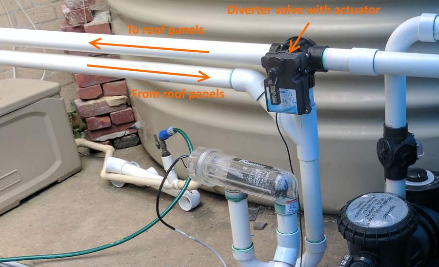 When the sensors indicate that the roof is warmer than the pool water (and the desired temperature is set above the current water temperature), the controller enables the solar by setting the diverter valve to direct water to the roof panels and switching on the pump (if it is not already on). Diverting the water is simple. Having the solar controller turn on the pump is more challenging that it seems, and is the subject of the next post.