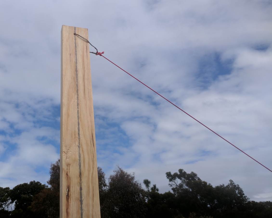 The basic fence design uses 1.2m high 12x12mm aviary mesh supported by 90x35mm wooden posts and 3mm fence wire supporting the top/bottom of the mesh. The bottom of the mesh is wired to small holes drilled in the shell at regular intervals to prevent any gap greater than 100mm, the maximum permissible.