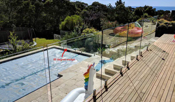 When I designed the pool, I placed the entrance in the corner nearest the main residence. The elevation of the pool deck at this point is 1200mm below that of the wooden deck above it, which is at the same level as the house. Stairs are thus required. Once through the gate I wanted the whole area to feel open and so designed the stairs to descend in both directions. The alternative of stairs descending towards the pool with a rail on the side would look quite awkward, creating a wall on the deck side of the stairs.