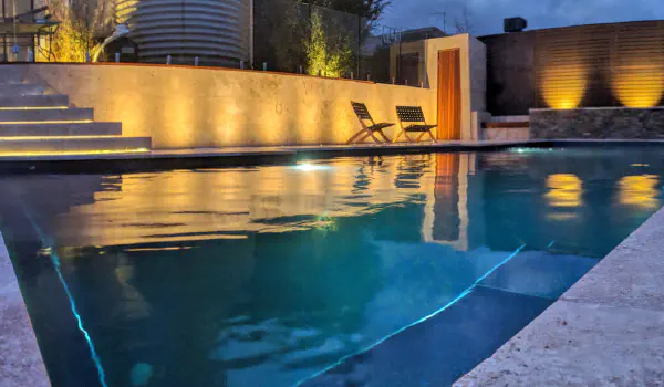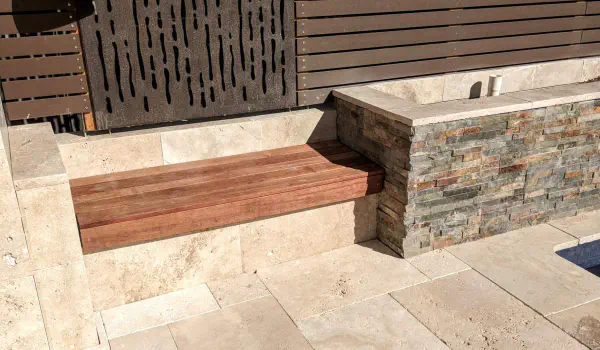 Around the pool perimeter we’re laying 30mm ivory travertine stone and continuing it onto the pool deck. The 30mm thickness provides a nice lip for the pool edge. The two main edging options for the lip are square edge or bullnose (i.e. rounded). Our stone tiles already have a square edge (bullnose edging typically costs more) and we’ll be keeping it.